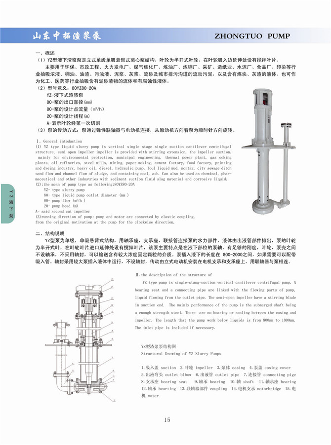 三、結構(gou)說明 YS-YZS型泵為單級(jí),單吸懸臂式結構(gòu),用軸承座,支承座(zuò),聯接管連接泵的(de)水力部件,液體由(you)出液管部件排出(chu),泵的葉輪📞為半👉開(kai)式葉輪,在葉輪葉(ye)片進口延伸處🌈設(she)有攪拌葉片,該泵(bèng)主要特點是在液(ye)📧下部位的泵🈚軸,有(you)足夠的剛度,葉輪(lún),泵殼之間不設軸(zhóu)承,不采用軸封,可(kě)以輸送含有較大(dà)濃度固體顆粒的(de)介質。泵⛹🏻♀️插入液下(xià)的長度在600—3000之間,如(ru)果需要可以配帶(dài)吸入管。